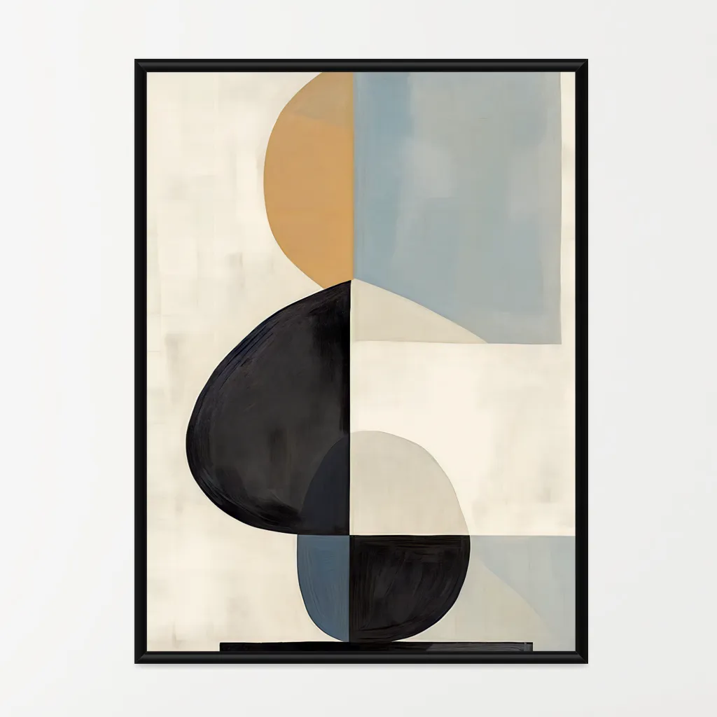 הפוסטר "Modern Symmetry" מציג עיצוב גיאומטרי מתוחכם עם אלמנטים צורניים פשוטים ונקיים. הצורות המרכיבות את הפוסטר הן בעיקר עיגולים וחצאי עיגולים בצבעים ניטרליים כמו שחור, חום בהיר ותכלת. עיצוב הצורות מדויק ומהווה מראה סימטרי נעים לעין. רקע הפוסטר בהיר ונותן תחושה של מרחב ואוויריות. הפוסטר מתאים לעיצוב מודרני מינימליסטי ומשדר תחכום ופשטות בו זמנית.