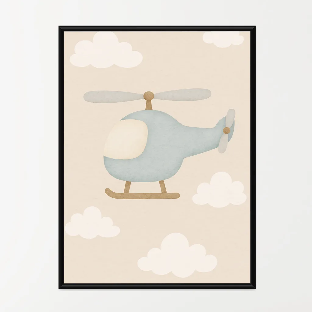 הכניסו אווירה של רוגע ושובבות לחדר עם "Soft Helicopter". התמונה מציגה הליקופטר מעוצב בגוונים מרגיעים של תכלת ובז', מעופף בנחת בין עננים לבנים ומזמינה אתכם לחלום על מסעות בין שמיים וארץ. עיצוב מושלם לחדרי ילדים או פינות משחק, המשלב עדינות ופנטזיה עם איכות וסטייל. תלו את "Soft Helicopter" על הקיר והעניקו לחלל נגיעה של חלום ורכות.