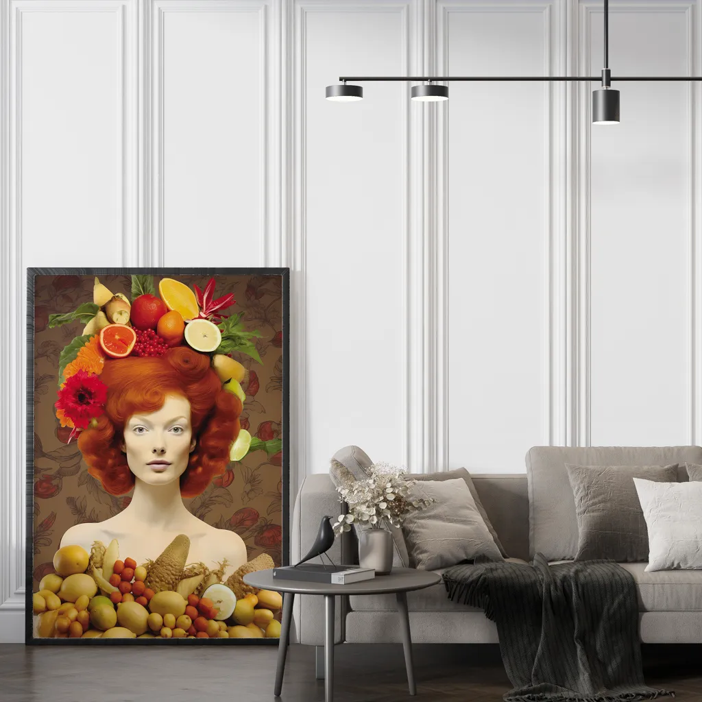 גלו את "מלכת הקציר" – יצירת אמנות יפיפייה ומרהיבה שתשדרג כל בית. התמונה מציגה דמות נשית עם שיער אדום בוהק, מעוטר בפירות ופרחים צבעוניים, המסמלים שפע, פוריות ורעננות. ברקע ניתן לראות דוגמאות טבע עדינות שמשתלבות בהרמוניה עם הדמות המרכזית. התמונה מושכת את העין בזכות קשת הצבעים העשירה והקומפוזיציה המושלמת. הוסיפו נגיעה של צבע וחיים לחלל המגורים שלכם עם היצירה המרהיבה הזו שהיא גם חגיגה לעין וגם השראה יומית.