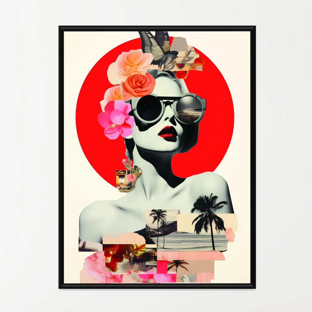 הכניסו ניחוח של קיץ נוסטלגי ובוהק לביתכם עם התמונה המדהימה "Retro Summer". יצירה מרהיבה זו מציגה שילוב מאושש של צבעים תוססים, פרחים פורחים ונגיעה וינטג'ית ייחודית. הדמות המרכזית, מעוטרת במשקפי שמש אופנתיות ובתכשיטי פרחים, משרה תחושת חופש ועליזות. הרקע האדום הבוהק מוסיף נופך דרמטי ועמוק, והפאלם והתמונות הקטנות משלימים קומפוזיציה מרגשת ומיוחדת. שילוב אומנותי זה יכניס חיים וצבע לכל חדר בו תבחרו לתלות אותו. הוסיפו את "Retro Summer" לאוסף האומנות שלכם ותיהנו מאווירת קיץ מתמשכת כל השנה.