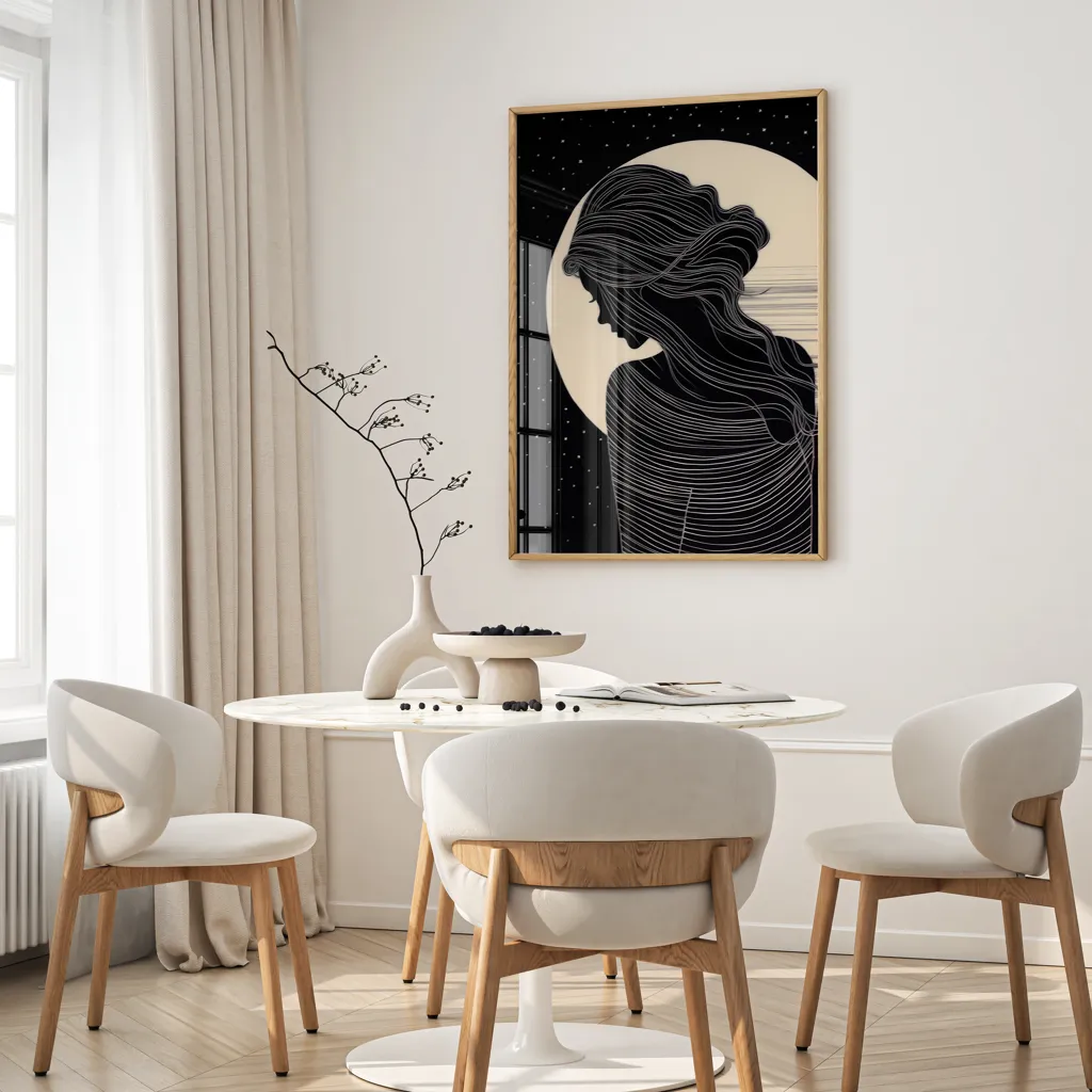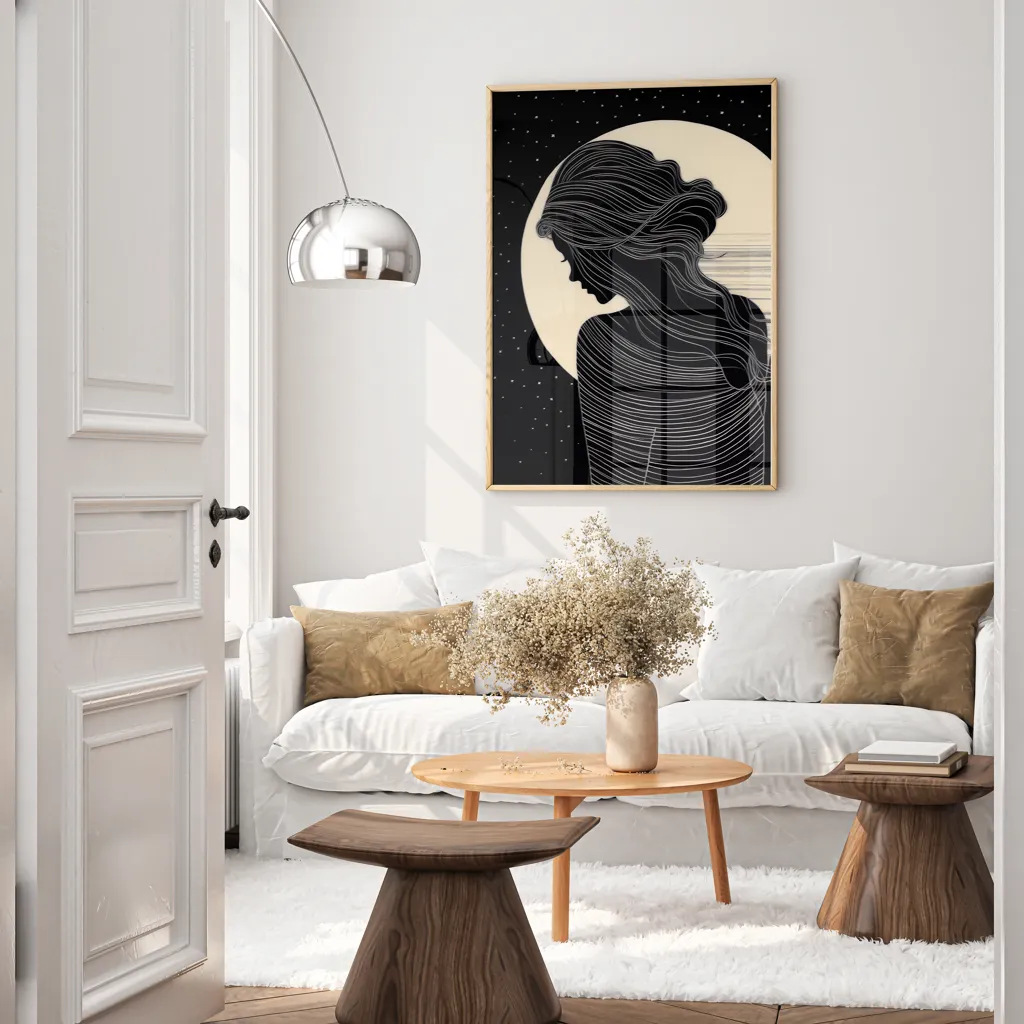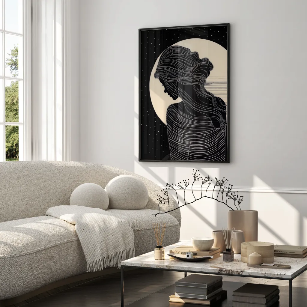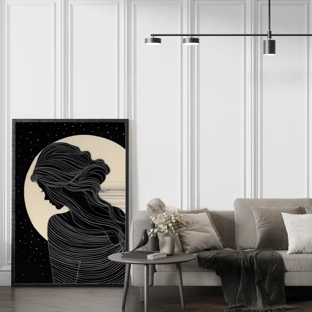 גלו את "Moonlit Muse" – יצירת אמנות המשלבת אלגנטיות וקסם לילי. התמונה המרהיבה הזו מתארת דמות מסתורית בכחול עמוק, שנראית כאילו היא מוטמעת בעולם של חלומות וחידתיות. פסי הקווים המעודנים והזרימה החיננית של קווי השיער, יוצרים תחושה של תנועה ועדינות הנשקפת מהירח המלא ברקע. זו לא סתם תמונה, אלא יצירת אמנות שתעורר השראה ותוסיף נופך של רומנטיקה וקסם לכל חלל שבו תוצב. המוזה המוארת באור הירח תהפוך כל חדר לחוויה אמנותית ואלגנטית. הזמינו עכשיו והכניסו קסם לילי לביתכם!