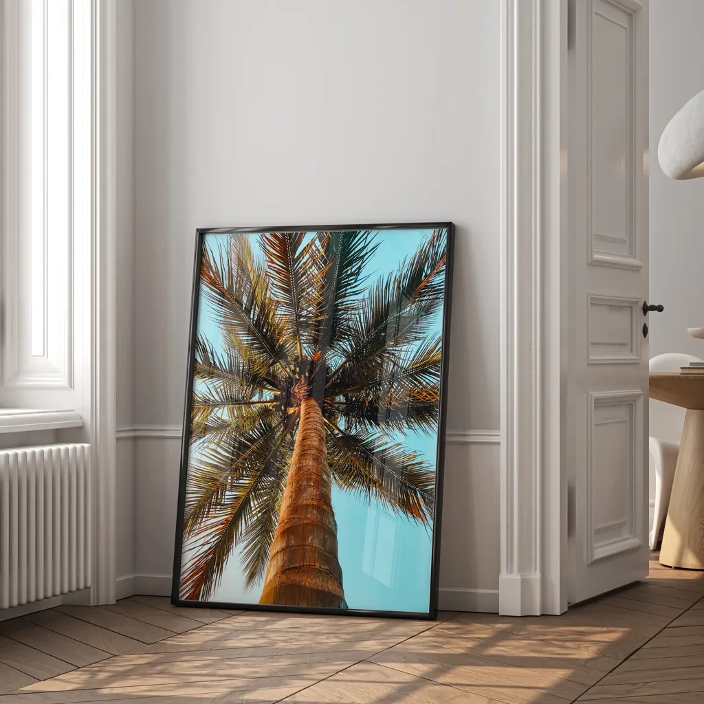 התמונה "Sunlit Fronds" מציגה את היופי הפראי והחושני של עץ דקל תחת אור השמש הזהוב. התמונה מתאפיינת בנקודת מבט מלמטה המעצימה את גובהו ואת שמי התכלת המסתעפים מעל. השילוב המרהיב של צבעי הירוק והחום עם קרני האור החמימות, מעניק לתמונה תחושה של חופש ושלווה טרופית, המתאימה לכל חלל בבית המודרני. "Sunlit Fronds" היא תוספת מושלמת לכל קיר שרוצה להשתדרג בנגיעה של טבע וזוהר אורבני. תנו לביתכם לזרוח עם פיסת גן עדן זו שתקנה תחושת רוגע ואווירה חלומית לכל מבט.