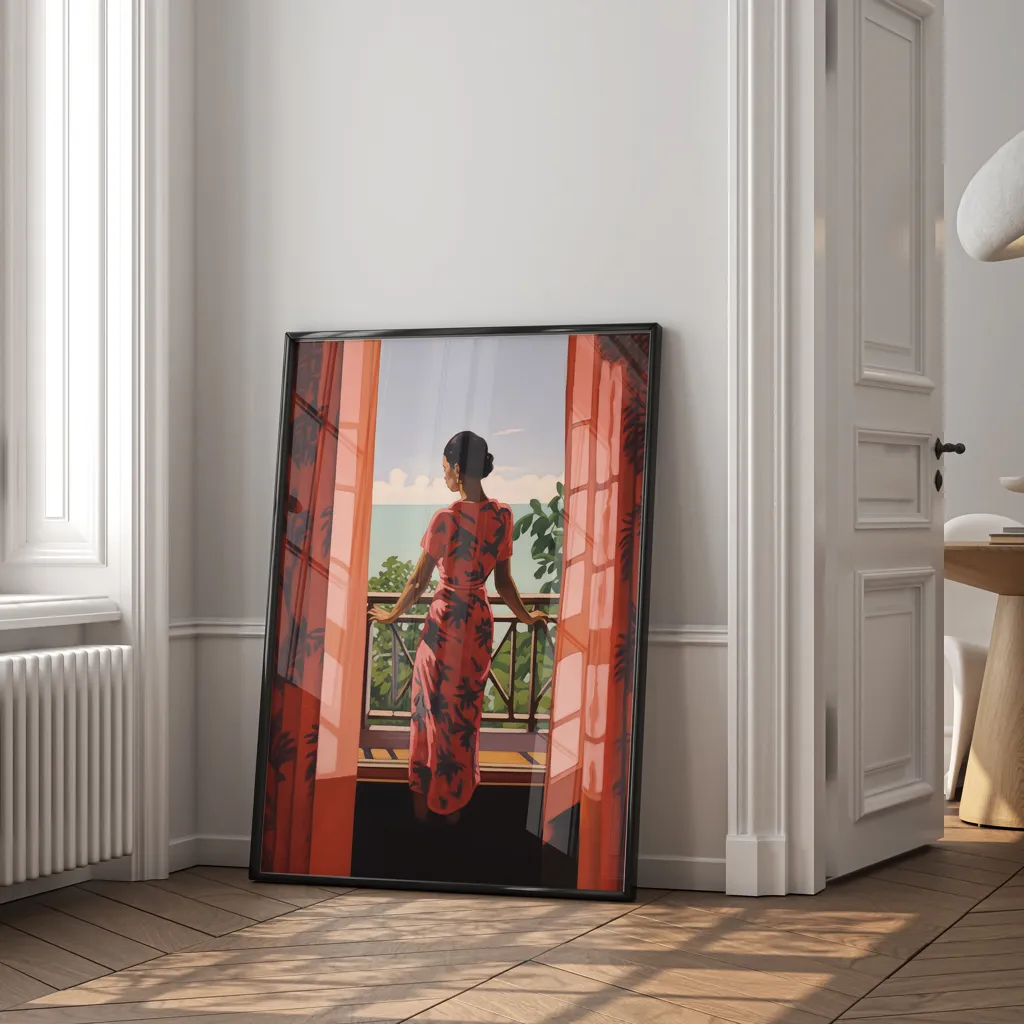 תנו לעצמכם להיסחף במרחבים של רוגע וחלומות בתמונה המרהיבה "Warm Reverie". הדמות הנשית שבמרכזה, עטופה בשמלת קיץ צבעונית ופונה אל נוף ים פסטורלי, מעוררת תחושת שלווה ומלנכוליה רכה. חלונות פתוחים לרווחה מכניסים את אור השמש החם, המשלב בין פנים וחוץ במיזוג מושלם. "Warm Reverie" היא לא רק יצירת אמנות, אלא גם הצהרה עיצובית שמוסיפה נופך של אלגנטיות וקסם לכל חלל בביתכם. הפכו את הסלון, חדר השינה או כל פינה אחרת למקום מלא בהשראה עם התמונה הייחודית הזו.